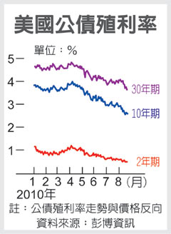 不久前美國投資人還爭相追捧短期公債,但近來公布的數據顯示美國經濟復甦失去動能,長期公債一躍成為市場寵兒。上周美國30年期公債價格勁揚,和價格背道而馳的殖利率跌至3.661%,逼近2009年4月以來低點。總計一周來,30年期公債殖利率已下降25.5個基點,創5月21日止那周來最大單周降幅。