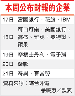 本周一連串重要財報出爐,科技股方面有蘋果、微軟、英特爾和IBM,金融股如花旗、美國銀行、富國銀行、高盛集團和摩根士丹利。可口可樂和麥當勞的財報也備受矚目。