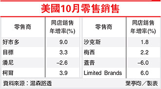 湯森路透追蹤的23家零售商中,10月同店銷售平均較去年同期成長3.4%,不如分析師預估的4.5%,也遜於8月的4.4%與9 月5.1%的強勁增幅。