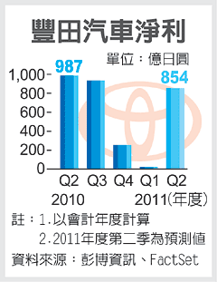 311大震及海嘯重創日本東北供應商,使日本汽車業者遭遇零件短缺,包括豐田汽車在內,可能使豐田的汽車產量及銷售比平常低落。FactSet分析師預估,豐田7至9月的會計年度第二季淨利為854億日圓(11億美元),不如去年同期的987億日圓。