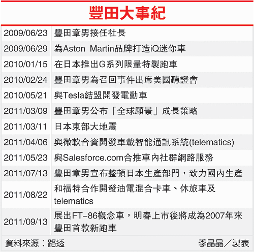 豐田去年汽車銷量勇奪全球第一,但2011上半年則被通用汽車(GM)及福斯(Volkswagen)超越而屈居第三。其產能已於9月重回海嘯前水準,較預估的12月提前,凸顯豐田強韌的復原力。