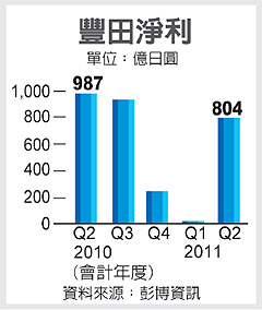 2011上半年度豐田淨利銳減72%至816億日圓,營收下跌17%至8.01兆日圓(1,030億美元)。