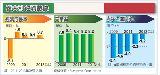 義大利在貝魯斯柯尼領導下,經濟成長停滯不前,過去10年情況尤其嚴重,主因是政府無法創造鼓勵投資的環境,也未能善用全球化的好處。如今義國的工業引擎地位已遙遙落後德國,最引以為傲的奢侈品產業也面臨亞洲製造商的激烈競爭。