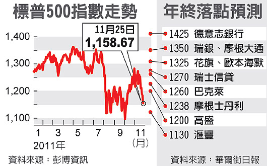 根據畢潤宜公司(Birinyi)資料,華爾街12家大型金融機構的策略師平均預估,標普500指數2011年底可能收在1,278點,比現在的指數高逾10%。今年初,這些策略師還曾喊出年底升抵1,365點。
