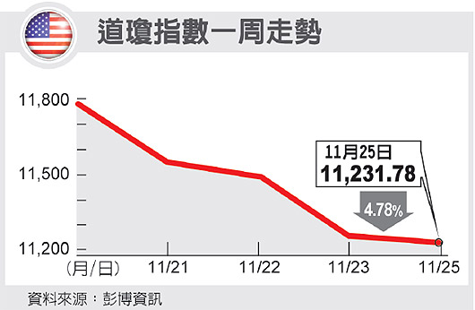 美股上周一展開就遭受一連串利空襲擊,國會無法為削減龐大預算赤字與延長振興措施至明年達成協議,道瓊周一重挫248點;周二公布的美國第三季經濟成長率自2.5%下修至2%,進一步挫低市場信心;周三德國公債拍賣狀況不佳,投資人擔心財政危機蔓延至歐洲最核心國家,使道瓊又重挫236 點。周四因感恩節休市,但周五義大利舉債成本飆至新高後,美股由紅翻黑。