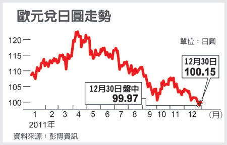 歐元匯價30日跌破100日圓大關,改寫11年來的新低紀錄,主要受歐債危機和歐洲經濟持續不振拖累。歐元兌美元也滑落到15個月來的低點。
