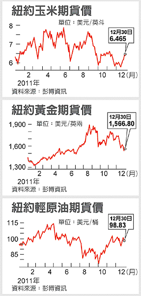 黃金價格在2011年上漲10%,寫下連續11年收紅的紀錄,儘管金價已從四個月前的高點回檔逾20%,分析師仍看好今年行情。油價以一年來上漲近13%封關,是連續三年收漲,但2012年能否維持在百元以上價位仍有待觀察。