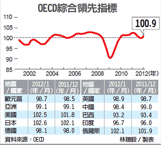 總部在巴黎的OECD說,衡量34個成員國經濟活動的綜合領先指標在2012年1月升至100.9,高於2011年12月的100.5,是連續第三個月攀高,增幅略大於前幾個月。