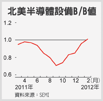 北美半導體設備製造商B/B值自去年10月觸底開始回升後,已連續五個月揚升,2月B/B值達1.01,創近17個月來新高。