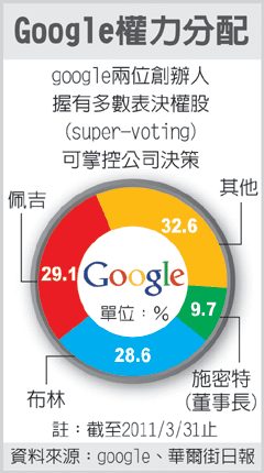 拜Googl八年前上市時創立的雙軌股權結構所賜,兩位創辦人和董事長施密特(Eric Schmidt)合計握有近七成投票權。這是因為他們手中的B股有較大的投票權,是大部分股東手中A股的十倍。
