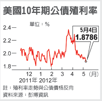 美國4月就業報告不如預期,加上法國和希臘本周末的選舉可能引發新一波市場震盪,投資人紛紛逃離股票等風險資產,轉進美國公債,使10年期公債殖利率跌至3個月低點。